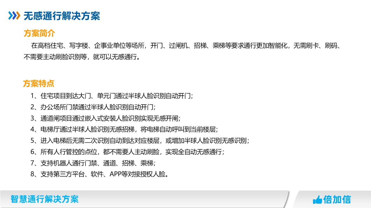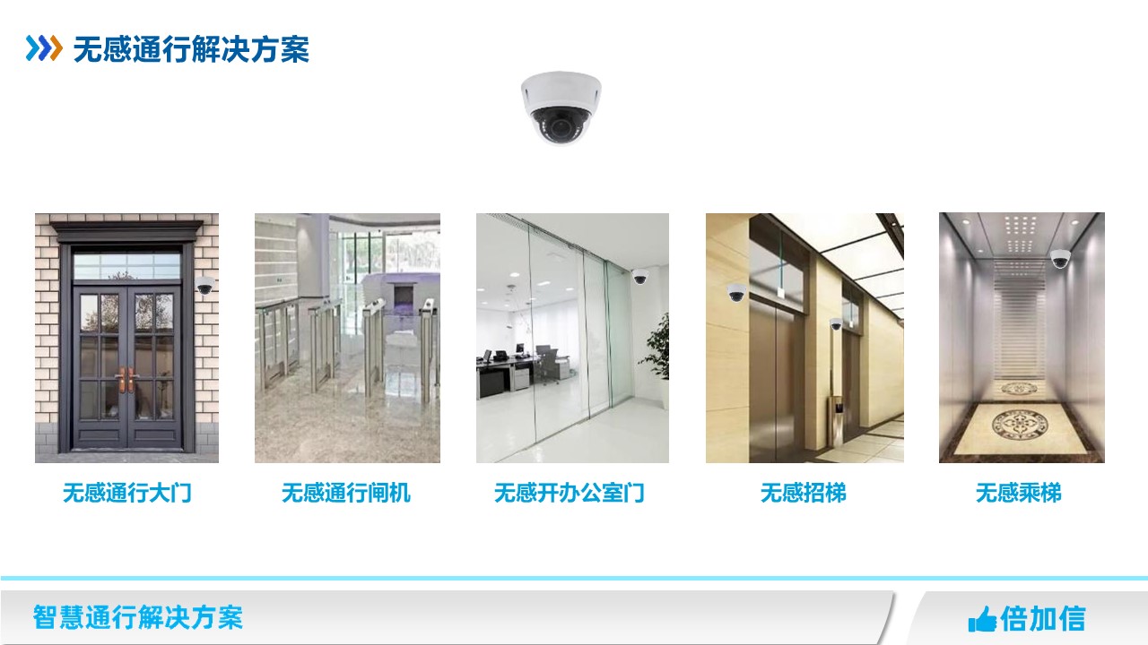 在高檔住宅、寫字樓、企事業單位等場所,開門、過閘機、招梯、乘梯等要求通行更加智能化,無需刷卡、刷碼、不需要主動刷臉識別等,就可以無感通行。
